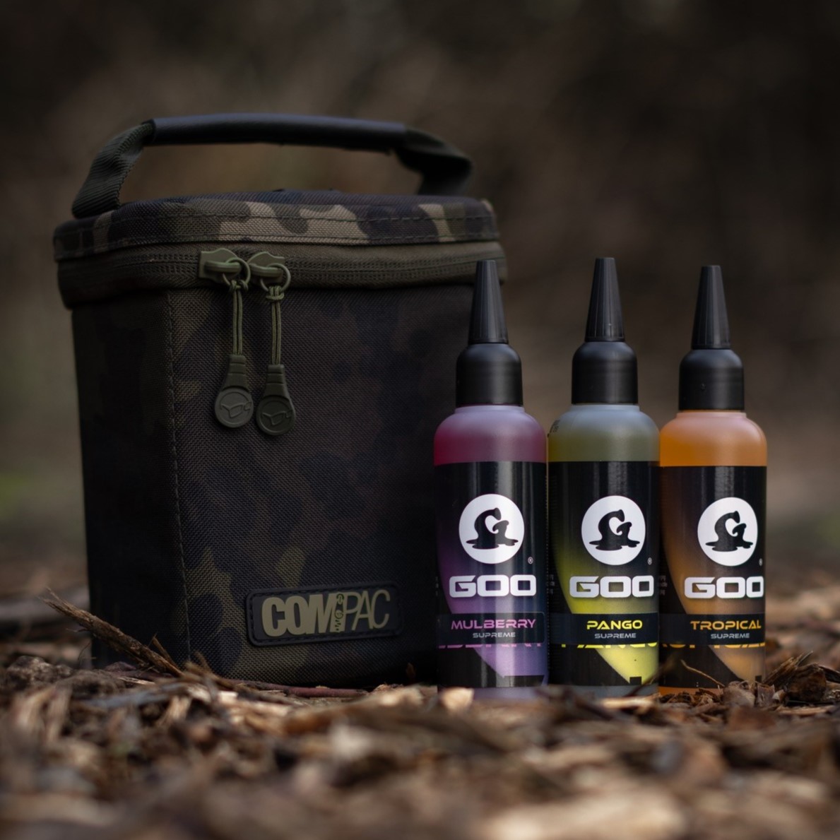The Korda Compac Dark Kamo Goo Bag is the perfect way to transport bottles of goo, the small size bag can hold 6 bottles!